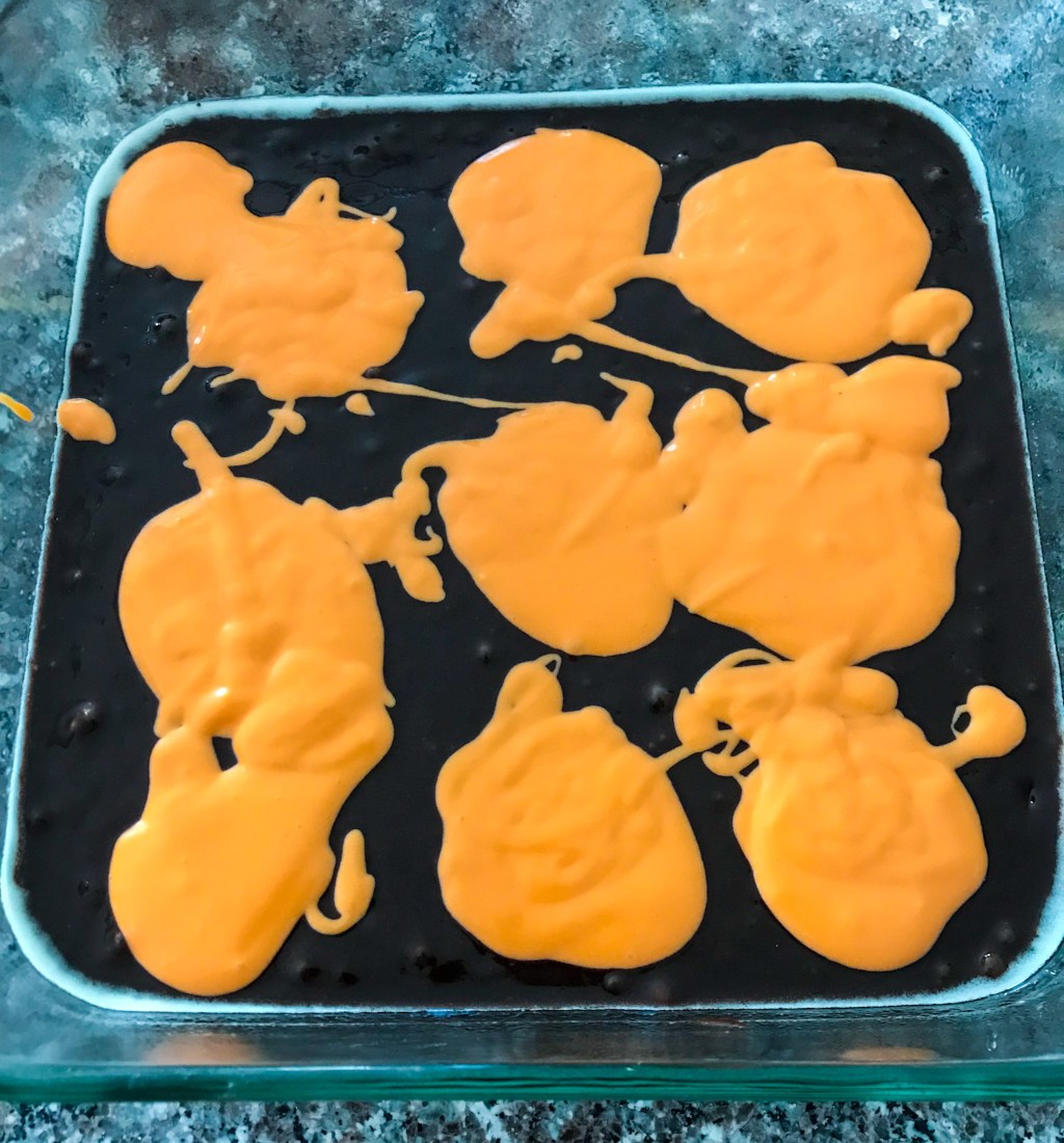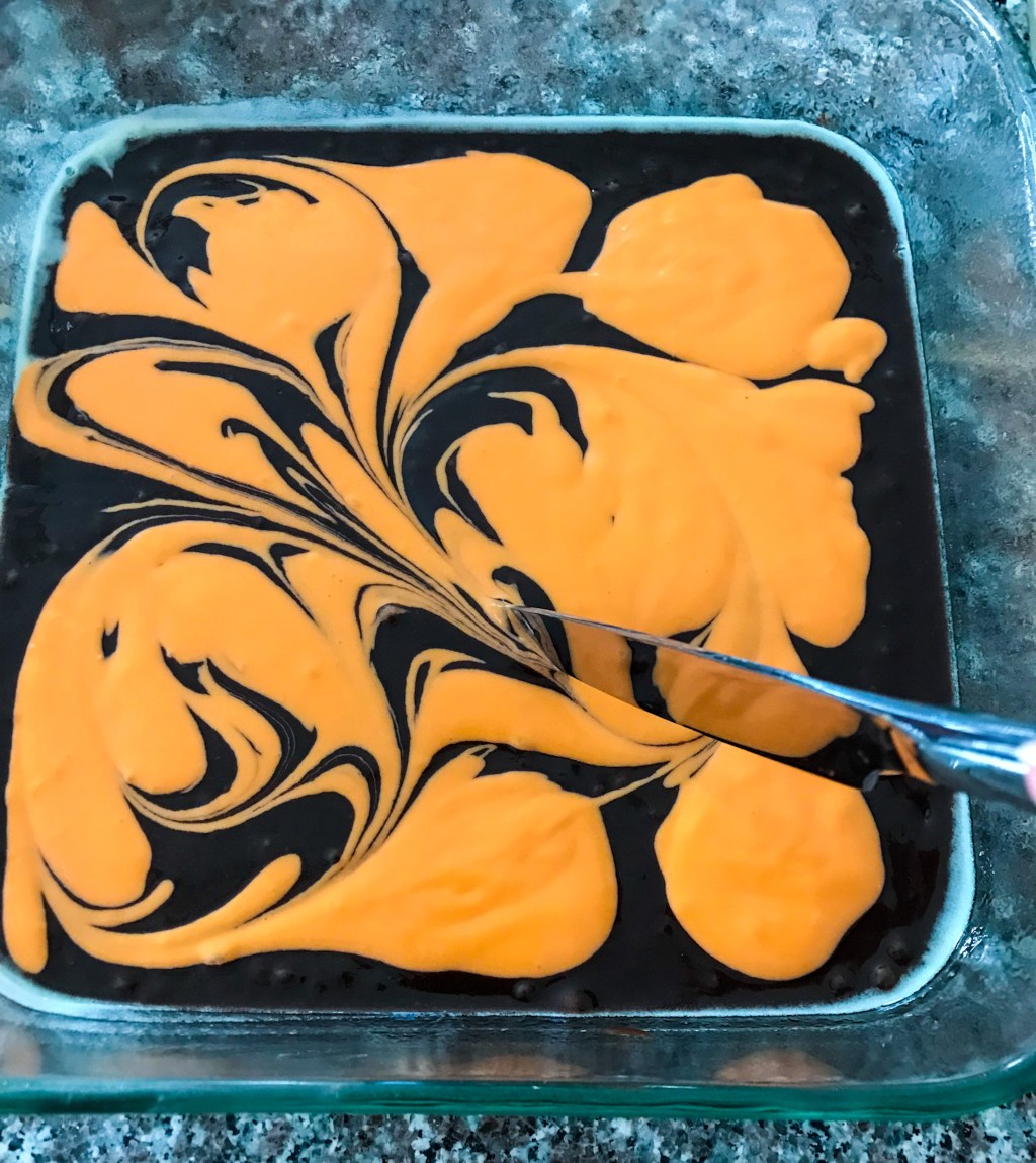 Then drop the orange filling by spoonfuls onto the brownie batter. Drag a butter knife through the brownies to swirl the filling throughout.