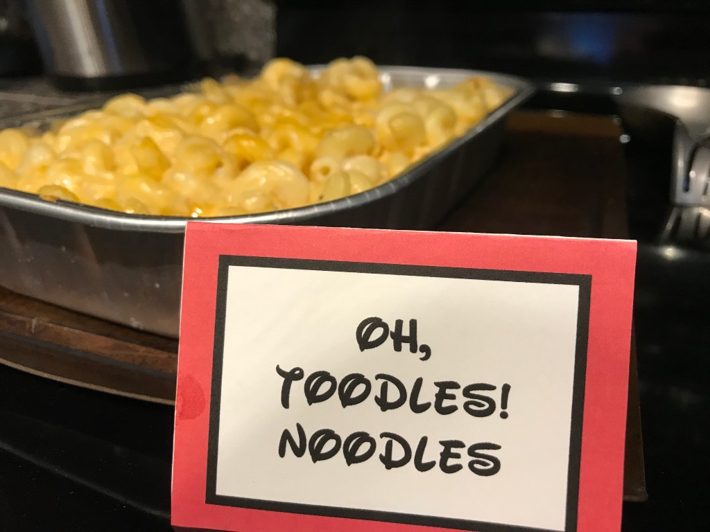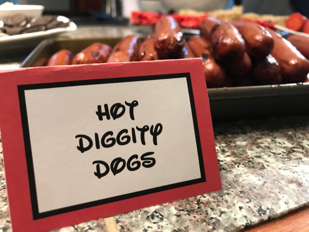 For this party, I pulled food inspiration from Mickey Mouse Clubhouse. We did Hot Diggity Dogs (hot dogs) as the foundation with condiments, hot dog chili, and cheese. I bought macaroni and cheese from Costco (on sale!) for my Oh, Toodles Noodles. You could absolutely make your own if you prefer.