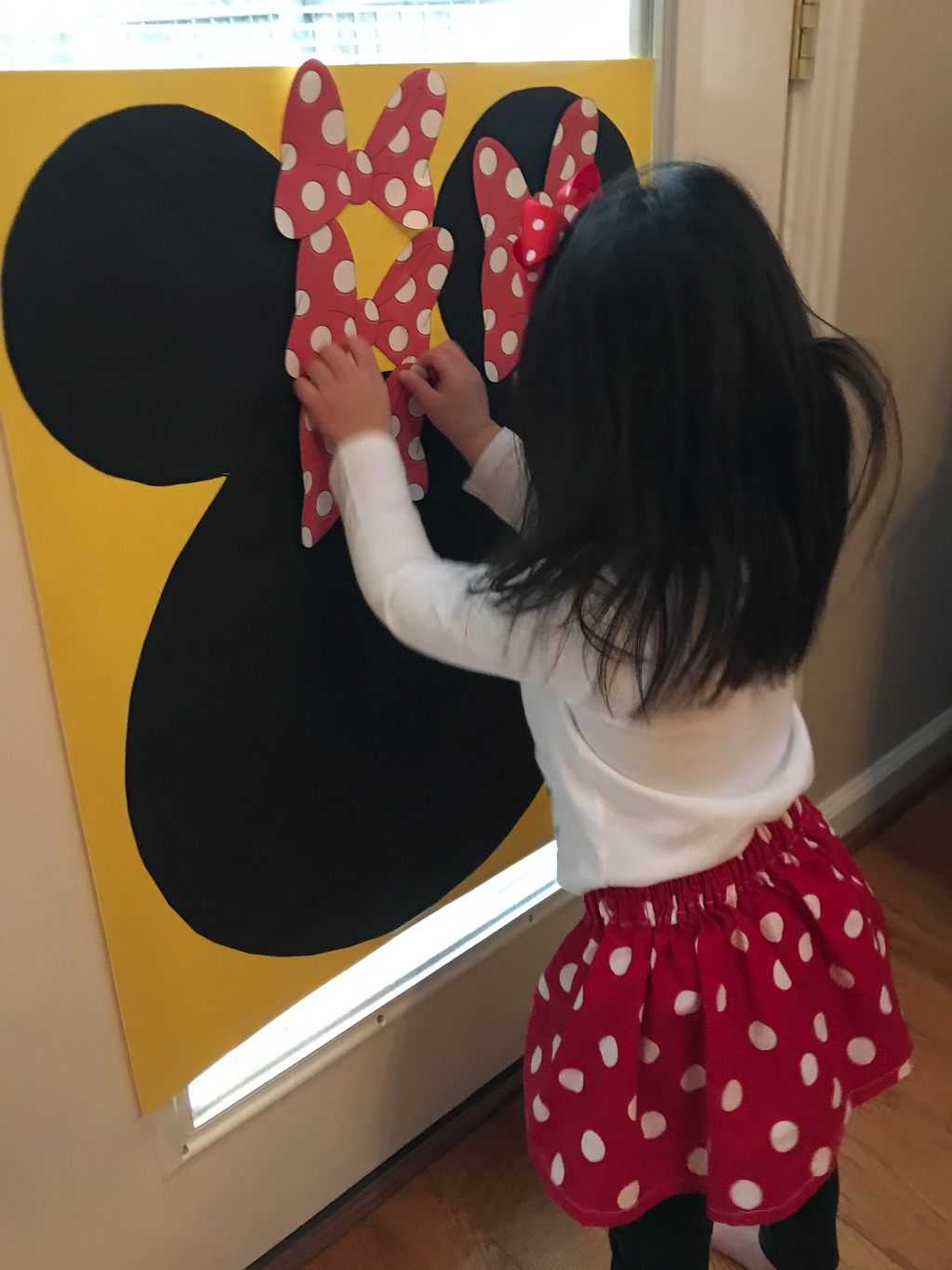 This was a four-year-old birthday party with kids under one, three, five, and seven years old, so I didn’t have any elaborate activities. But I did make a DIY pin the bow on Minnie Mouse game for less than two dollars that the older kids loved. I bought a piece of black poster board and cut a simple Mickey silhouette from it. Then I glued it on a yellow poster board I already had. I printed bows on cardstock and let the kids spin and attach them with tape. Don’t forget to get your free download of the Minnie Mouse bow and food label images here!