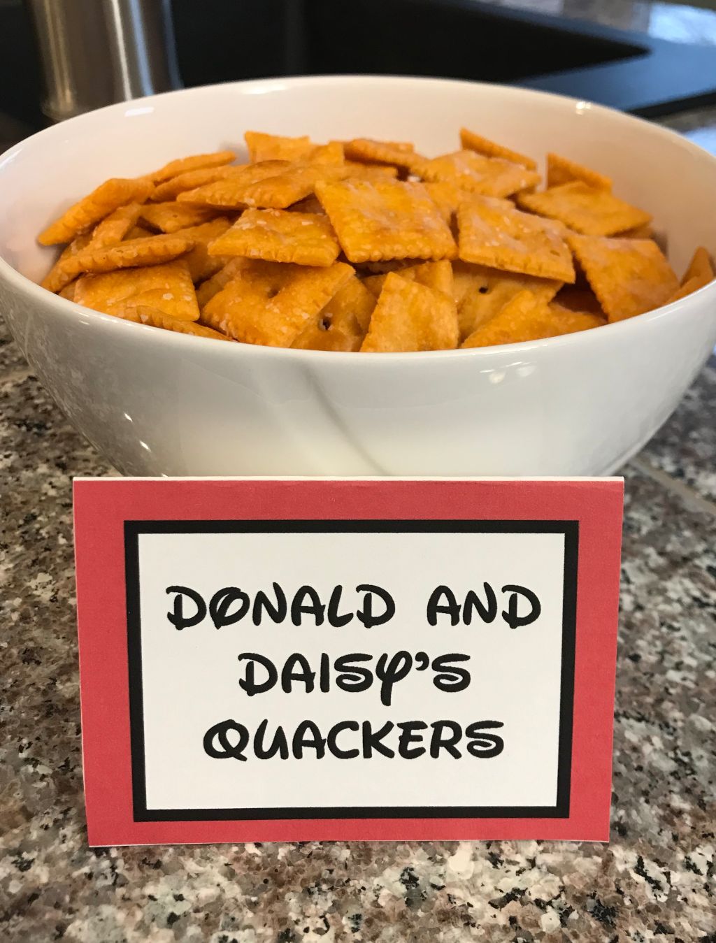 For side dishes, I served strawberries and blueberries on toothpicks in the shape of hair bows, aptly named Minnie’s Bow-tique. Potato chips and Cheez-Its became “Chips and Dale” and “Donald and Daisy’s Quackers,” respectively.